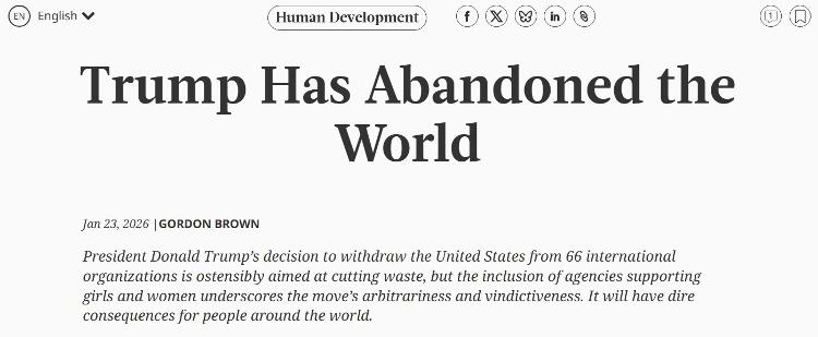 布朗在文章中指出,美国宣布退出的66个国际组织中,包括31个联合国附属组织和35个非联合国组织。他说没有一个领导人能够在短短一个月内如此彻底地断绝他的国家与国际社会的联系。